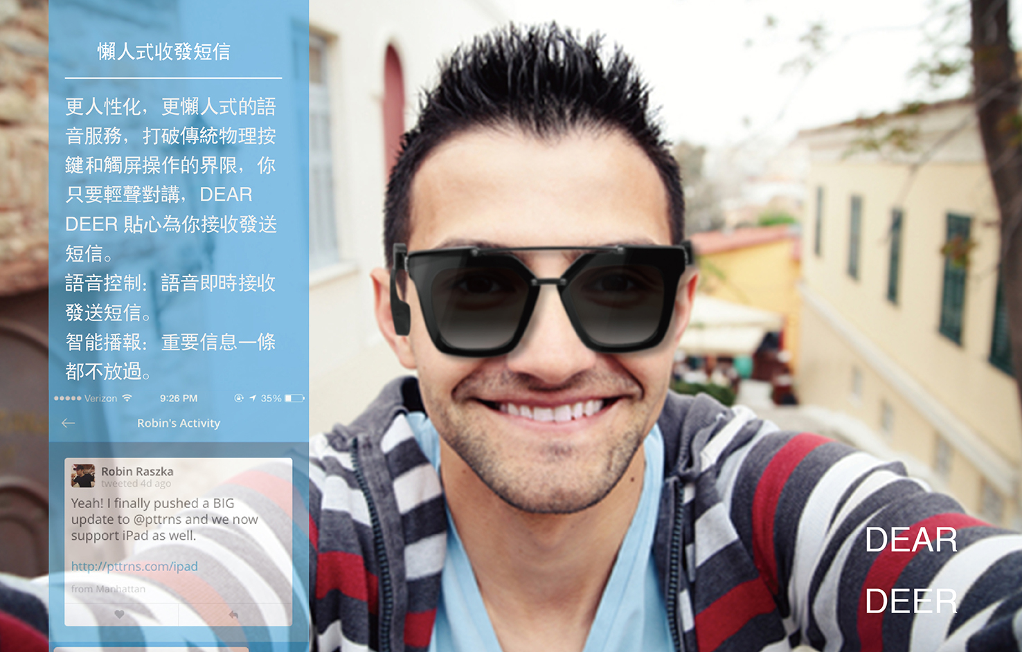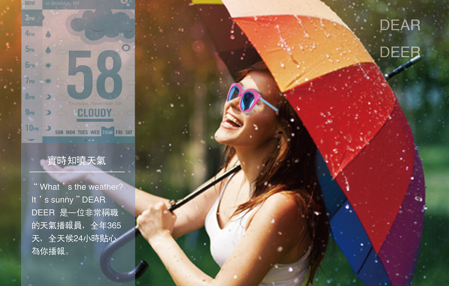DEAR DEER有令人無法想像的獨特語音交互識別;它讓你跟情人通話時可以遠離『手』上冰冷的『機』器!學生或社會人士在不同兩地處理共同事務時,能一邊溝通意見、一邊處理手邊的報告!商務談判時能與戰略團隊溝通於無形!發短信時免除雙手的忙碌!心情差還能講笑話給你聽、陪你聊天!迷路時為你指引明路(導航)!當你貼心的秘書,提醒你開會時間與生活雜事!與國際友人溝通時幫你翻譯 ...。